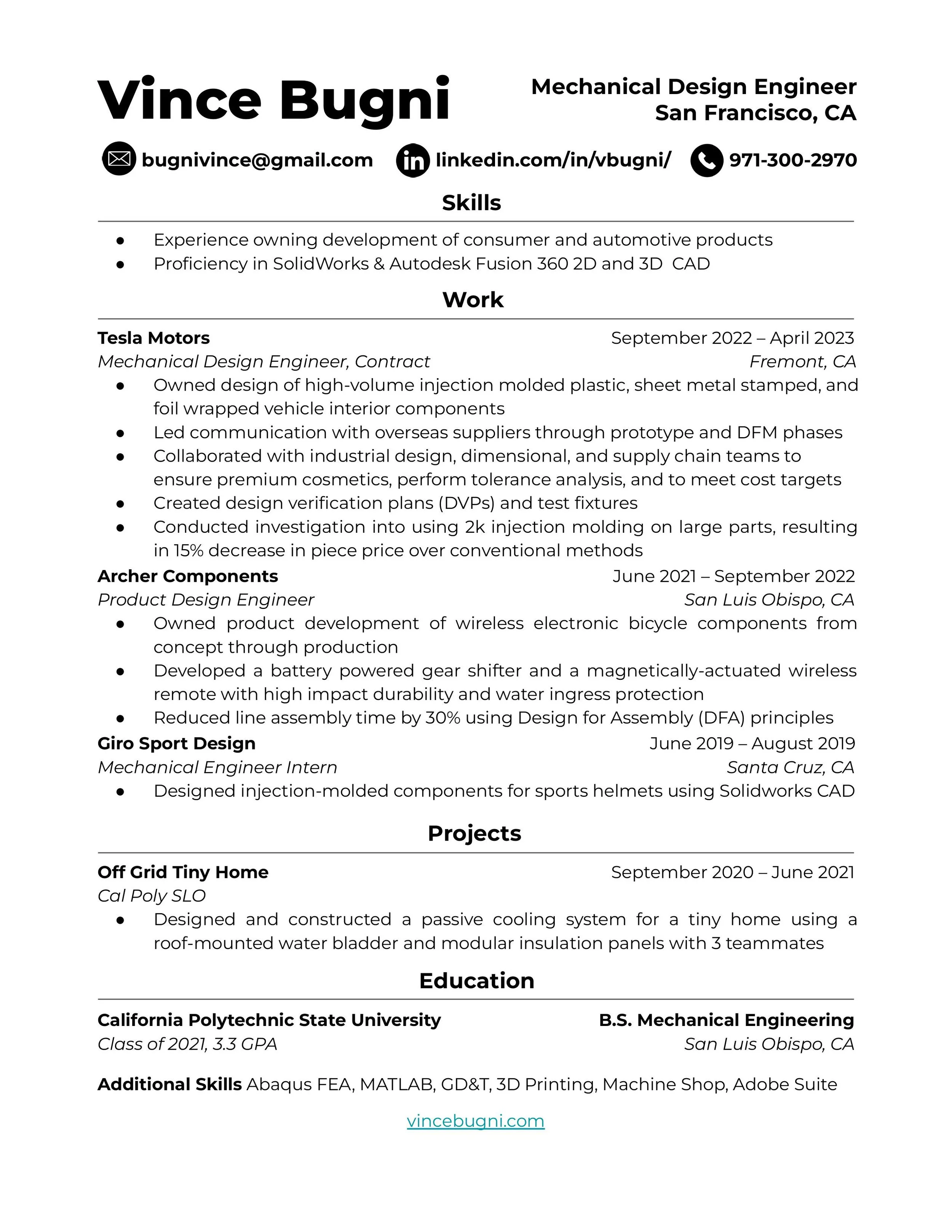Hi, my name is Vince! I’m originally from a small town in Oregon and now call San Francisco, CA my home. I studied Mechanical Engineering at Cal Poly SLO and graduated in June 2021.