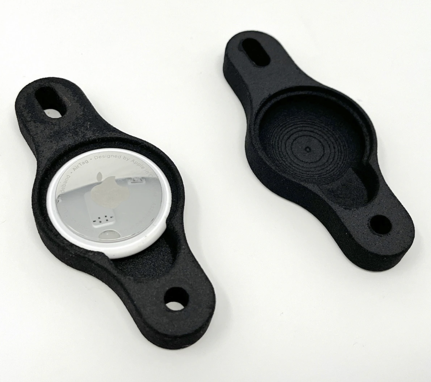 The BikeTag allows the user to discretely attach an Apple Airtag to their bicycle between the water bottle cage and the frame. It is made with flexible TPU for ease of installing and removing the Airtag.